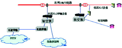 在發展中國家,這一矛盾尤其突出。就國內的情況而言,我國幅員遼闊,有相當數量的農村地區處于偏遠、人煙稀少的地帶,這些區域的通信發展相對滯后。據統計,我國行政村固定電話覆蓋率為94%~97%,數據通信的覆蓋率則更低。由于自然和經濟條件的制約,若采用現有的通信方式,改善這些地區的信息服務將面臨越來越多的困難。而行政村的通電率已接近100%,且電網覆蓋是區域發展的基本條件,因此,利用電力傳輸網絡實現寬帶網絡接入,是適合國情、可行并且經濟的方案,圖1為農村中壓PLC接入網系統的結構示意圖。