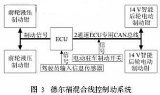 混合線控制動系統是一種新型的制動系統,該系統由德爾福公司推出,主要用于乘用車、SUV和輕型汽車。這種系統將成為采用電子控制的電制動線控技術的重要基礎,它用后輪電動制動鉗來代替傳統后輪液壓制動鉗,并與電動駐車制動集成,而傳統的液壓制動鉗/真空助力器仍應用于前輪制動,其結構如圖3所示。