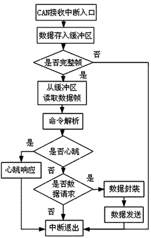 當CPU檢測到溫度出現異常,會根據溫度異常范圍向上位機發出溫度異常警報,這是該節點CPU唯一主動向上位機發出的數據幀。該節點的溫度相關數據存放在緩沖區,在沒有收到上位機數據請求的時候,該緩沖區的數據會不斷的被新的數據刷新,以保證該節點數據的實時性,中斷流程如圖5所示。