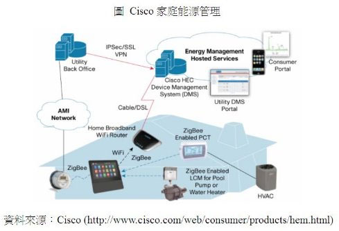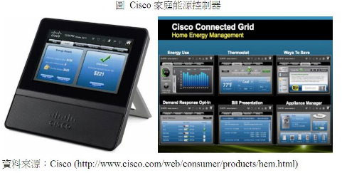在綠色節(jié)能觀念的日益普及趨勢下,有效管理家中用電的家庭能源管理(Home Energy Management,HEM)成為智慧電網(wǎng)公共建設(shè)外,另一項具備高度發(fā)展?jié)摿Φ氖袌鲱I(lǐng)域。面對民眾對節(jié)能管理的需求,現(xiàn)階段陸續(xù)已有許多國際大廠投入相關(guān)應(yīng)用與服務(wù)的研發(fā);除了Google推出PowerMeter的用電監(jiān)測網(wǎng)路平臺外(需搭配智慧電表或插座等設(shè)備),Cisco與Intel也陸續(xù)搭上平板電腦熱潮,推出協(xié)助民眾管理家庭用電的HEM裝置。相較于Google PowerMeter,Cisco與Intel所推出產(chǎn)品是以物聯(lián)網(wǎng)(Internet of Things,IoT)概念為基礎(chǔ),透過無線網(wǎng)路模式連結(jié)家中各項電器設(shè)備,進(jìn)行用電資訊的傳遞與監(jiān)控,同時進(jìn)行遠(yuǎn)端遙控動作。 Cisco推出包含家庭能源控制器(Home Energy Controller,HEC)與能源管理服務(wù)平臺的家庭能源管理解決方案(Home Energy Management Solution,HEMS),作為進(jìn)入家庭節(jié)能市場的第一步。 HEC如同家庭中的監(jiān)控中心,除了可以在螢?zāi)簧霞磿r顯示家中用電的即時狀態(tài)資訊外,使用者透過觸控面板的HEC還可以對連線的家電產(chǎn)品進(jìn)行操控,決定是否關(guān)閉或調(diào)整特定家電來節(jié)省電力消耗。