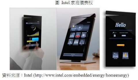 在家庭能源管理的概念下,Intel也推出暫稱為「家庭儀表板(Home Dashboard)」的整合性解決方案,產(chǎn)品設(shè)計為一個具備運算能力且低耗能的平板電腦。 Intel規(guī)劃此產(chǎn)品成為家庭網(wǎng)路的核心(Heart of the Home Network),使用者可與智慧家電、智慧插座、智慧電表與家中各項感測裝置進(jìn)行連結(jié)與監(jiān)控動作,并進(jìn)行家電設(shè)備的安全設(shè)定、溫控設(shè)定、電源