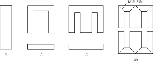 疊片式鐵心是把硅鋼帶材通過剪切或沖壓成鐵心片,然后疊裝成一定結(jié)構(gòu)形式的鐵心。從鐵心片形狀發(fā)展來看(圖1),最早是單I形,后來是CI形、EI形和EE形,其目的是便于疊裝,減少工時(shí)。如果材料是取向硅鋼帶,要注意使磁路中磁力線方向與硅鋼取向一致,不要與硅鋼取向垂直,否則會(huì)增加鐵心激磁能量和鐵心損耗。為了解決轉(zhuǎn)角處磁力線方向不與硅鋼取向垂直,后來又發(fā)展成45°斜切角形片形。
