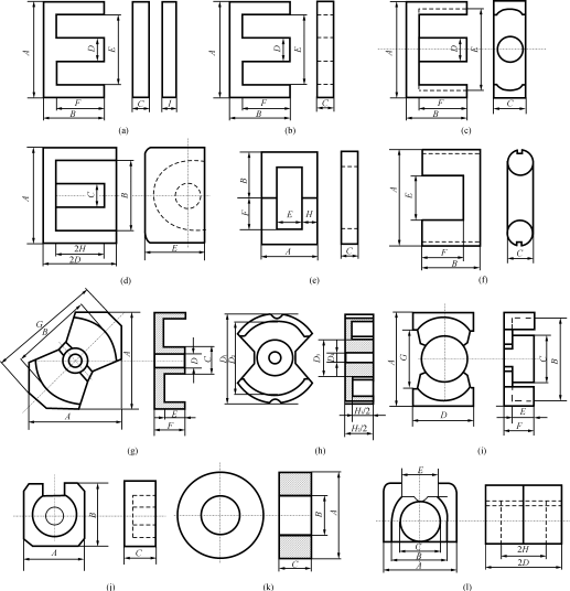 軟磁鐵氧體的鐵心結(jié)構(gòu)比較多,這是由于采用熱壓工藝,比較容易加工成各種形狀。有EI、EE、EER、EP、UF、UYF、RM、PM、PQ、Q(罐形)、T(環(huán)形)和LP形等等(圖8)。EI形以尺寸A(E形鐵心寬度)為標(biāo)志,EE形以尺寸A(E形鐵心寬度)和2×B(E形鐵心長度)為標(biāo)志,已形成EI10~50,EE8.3/8.0~110/80系列,品種多,制造工藝簡單成熟,散熱好,便于引出接線,成本較低。缺點(diǎn)是鐵心中間柱截面為方形,給線圈繞制帶來麻煩。同時(shí),無屏蔽,容易產(chǎn)生雜散磁場(chǎng)干擾。EER形也是以尺寸A(E形鐵心寬度)和2×B(E形鐵心長度)為標(biāo)志,已形成EER25/33~54/50系列,鐵心中間柱截面為圓形,繞線比較方便,同時(shí)繞線長度比方形截面縮短11%,從而降低銅損。
