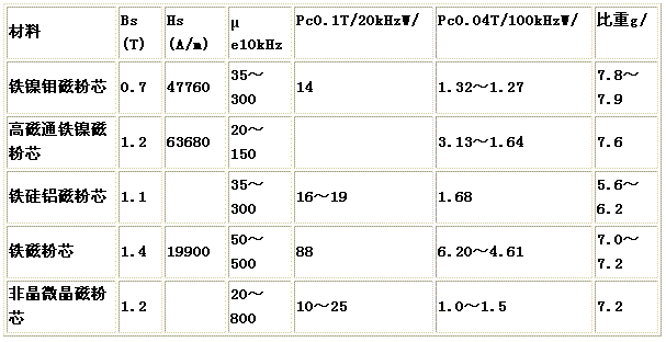 對(duì)磁粉芯提出的指標(biāo)有飽和磁通密度Bs、有效磁導(dǎo)率μe、有效品質(zhì)因數(shù)Qe、有效磁導(dǎo)率溫度系αμe及居里點(diǎn)、比重等。主要的磁粉芯的性能參數(shù)如表1所示。鐵鎳鉬磁粉芯國家標(biāo)準(zhǔn)型號(hào)為FN81,上海鋼鐵研究所型號(hào)為SN,美國阿諾德公司型號(hào)為MPP,磁導(dǎo)率高,工作環(huán)境適應(yīng)范圍廣,損耗低,但價(jià)格貴。鐵鎳高磁通磁粉芯國家標(biāo)準(zhǔn)型號(hào)為FN50,美國阿諾德公司型號(hào)為HF,飽和磁通密度高,磁導(dǎo)率中等,損耗也較低,價(jià)格較便宜,國內(nèi)外最近比較重視研究和使用。鐵硅鋁磁粉芯上海鋼鐵研究所型號(hào)為SA,美國阿諾德公司型號(hào)為MS,是一種價(jià)格較低,綜合性能指標(biāo)較好的磁粉芯。鐵磁粉芯上海鋼鐵研究所型號(hào)SF,國外一般型號(hào)為IP,磁導(dǎo)率和飽和磁通密度高,但在高頻下?lián)p耗大,只適用于低頻和20kHz以下的中頻使用。由于價(jià)格便宜,可以把它加工成大型磁粉芯,代替硅鋼,作為大容量直流電源的濾波電抗器。
