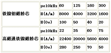除了表1所列性能而外,一般還給出有效磁導(dǎo)率μe與頻率f的關(guān)系曲線。與軟磁鐵氧體類似,在超過一定極限工作頻率以后,有效磁導(dǎo)率會(huì)迅速下降。同時(shí),還給出在有效磁導(dǎo)率μe下降50%的外加磁場(chǎng)強(qiáng)度,也就是恒磁范圍。表2是鐵鎳鉬磁粉芯和高磁通鐵鎳磁粉芯的恒磁范圍。還有,對(duì)用于輸出濾波器的磁粉芯,必須給出交直流同時(shí)磁化曲線,表示在大的直流磁化條件下,磁粉芯有效磁導(dǎo)率的變化情況。
