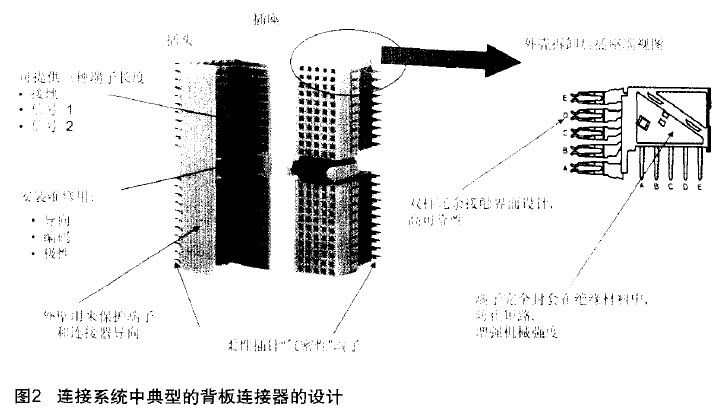 圖2是典型的連接系統(tǒng)中背板連接器的設(shè)計。它可以提供三種端子長度,即接地端子、信號1端子、信號2端子三個端子的長度是不同的。這是為了保證插座和插針在互相連接的時候,如果接反了,就無法插入。第二個是中問部分,它是用于安裝維修用的,整個插針板在插入的過程中,可以用來導(dǎo)向,甚至可以保證編碼和極性的正確。外壁用來保護(hù)端子和連接器的導(dǎo)向,這個端子就是插針部分,采用柔性插針。從右半部分圖中可以看到,外殼被拆除后,更清楚地顯示出了接觸面。它采用了雙柱冗余的接觸面設(shè)計,這樣可以大大提高接觸的可靠性。