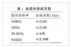 導線的電阻對信號的影響很小,可以忽略不計。電纜的分布電容C主要是由雙絞線的兩條平行導線產生。信號的損失主要是由于電纜的分布電容和分布電感組成的LC低通濾波器。通訊波特率越高,信號衰減也會越大。常規電纜的衰減系數見表1。