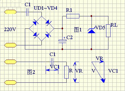 由于R甚小于XC1,R上的壓降VR也遠(yuǎn)小于C1上的壓降,所以VC1與電源電壓V近似相等,即VC1=V。根據(jù)電工原理可知:整流后的直流電流平均值Id,與交流電平均值I的關(guān)系為Id=V/XC1。若C1以uF為單位,則Id為毫安單位,對于22V,50赫茲交流電來說,可得到Id=0.62C1。