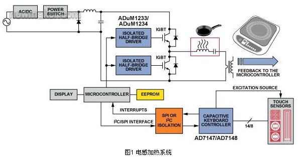 由于在大電流電感電路中可能會產生大電壓,因此在系統中的關鍵位置提供電氣隔離是十分重要的。特別是電磁爐的功率級與微控制器和其它數字電路隔離。一種隔離方法是使用隔離IGBT驅動器。與傳統的隔離解決方案相比,基于ADI公司創新的iCoupler®技術的低成本隔離門級驅動器串聯電路具有很多優點。