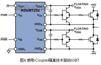 ADI公司的隔離門級驅動器系列產品采用iCoupler技術,其中雙通道 ADuM1233(圖3)提供了輸出通道和輸入通道之間的隔離以及兩個輸出通道之間的隔離,適用于IGBT控制通道的隔離。