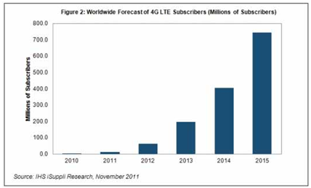 根據(jù)IHS iSuppli公司的智能手機(jī)與融合設(shè)備市場研究報(bào)告顯示,在移動網(wǎng)絡(luò)運(yùn)營商的大力支持下,下一代4G無線標(biāo)準(zhǔn)——長期演進(jìn)(LTE)在今年以及未來幾年將取得驚人的增長,增長率將高達(dá)數(shù)倍甚至數(shù)十倍,到2015年其用戶數(shù)量將達(dá)到相當(dāng)可觀的水平。