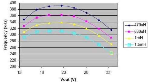 下圖給出了頻率根據不同的輸出電壓和不同的電感值的變化曲線。