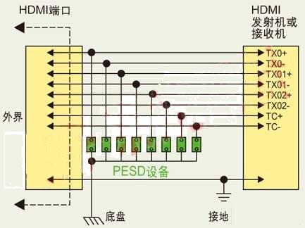 圖中展示了PESD器件對HDMI接口電路進行保護的典型應用圖。