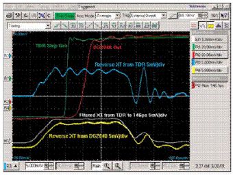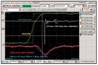 綠色波形是快沿TDR脈沖(R1),白色波形(R4)是由它導致的串擾。