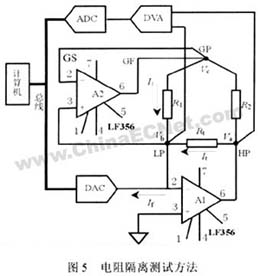 A2構成電壓跟隨電路使Vc =Vb,從而I1=0。因此計算機通過16位電流輸出型DAC設定If 就控制了流過被測電阻Rt的電流I t,再通過由DVA和ADC構成的電壓檢測電路測試出 Rt兩端的電壓就可算出Rt 的阻值。