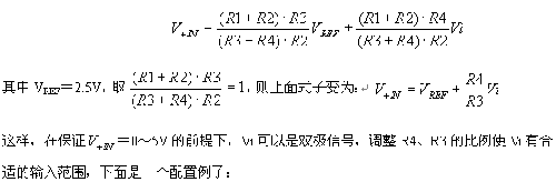 ADS7864模擬輸入通道的+IN和-IN的最大電壓輸入范圍為-0.3V~+5.3V(ADS7864 +5V供電)。圖3的電路中使用了2個運放,A1用作跟隨器,用來緩沖ADS7864輸出的2.5V基準電壓源;A2和四個電阻構(gòu)成了信號調(diào)理網(wǎng)絡(luò),適當(dāng)配置R1~R4電阻可以實現(xiàn)對輸入信號Vi的縮放和平移以適合ADS7864模擬通道的輸入要求。+IN端的輸入電壓表示如下: