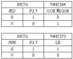 系統(tǒng)采用89C51的P2.7尋址ADS7864,地址為8000H,同時用這個地址信號配合89C51的/WR和/RD信號作74HC244和74HC373的使能信號。要求當(dāng)89C51的/RD=0,P2.7=1時才開啟74HC244,讀取ADS7864的轉(zhuǎn)換結(jié)果;當(dāng)89C51的/WR=0,P2.7=1時74HC373才鎖存89C51 P0口上的數(shù)據(jù)信號,實現(xiàn)往ADS7864的控制端寫數(shù)據(jù),其它時候74HC244和74HC373都是關(guān)閉的,這樣避免了89C51 P0口上的其它信號對ADS7864的干擾。采用鎖存器74HC373來連接89C51和ADS7864的原因是為了在ADS7864轉(zhuǎn)換數(shù)據(jù)的時候保持/HOLDA~/HOLDC、A0~A2端的電平保持不變,免得影響ADS7864轉(zhuǎn)換數(shù)據(jù)的精度。74HC244和74HC373的使能信號真值表如下: