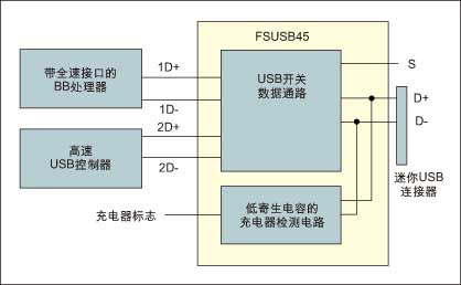 隨著目前的市場趨勢向單一USB充電器/數據端口的轉變,特殊應用USB開關已經成為帶充電器檢測功能的手機設計中的一種常規配置。圖2是這種開關應用的一個范例。