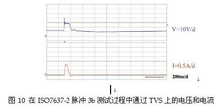 以SMAJ24A為例,從產(chǎn)品數(shù)據(jù)表摘取這些參數(shù)與圖11的曲線進(jìn)行比較,發(fā)現(xiàn)SMAJ24A符合ISO7637-2脈沖2測試的要求,可承受長達(dá)1.2ms的360 W指數(shù)脈沖,這個(gè)數(shù)值遠(yuǎn)遠(yuǎn)高于ISO7637-2脈沖2電涌強(qiáng)制的4μs時(shí)長。