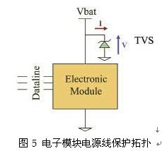 車載模塊的電源線保護(hù)是在汽車環(huán)境中需要關(guān)注的另一個(gè)問題,這個(gè)問題涉及ISO7637-2標(biāo)準(zhǔn)。例如,為滿足ISO7637-2標(biāo)準(zhǔn),特別是圖1中的1、2、3a和3b的脈沖要求,只使用一個(gè)瞬變電壓抑制器(TVS)即可有效保護(hù)車載模塊。