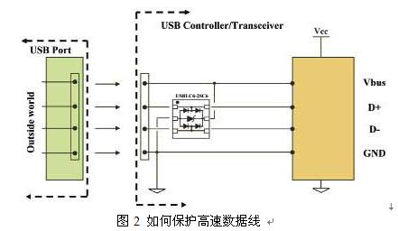 這個(gè)辦法的實(shí)質(zhì)是在USB接口附近連接一個(gè)保護(hù)元器件。它由幾支采用軌對軌結(jié)構(gòu)的二極管組成,本身具有低電容的特性。內(nèi)部鉗位器件為兩條數(shù)據(jù)線提供±25kV ESD (ISO10605)保護(hù)功能,以及為Vbus電源線提供保護(hù)功能。