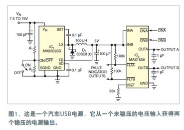 PND(個(gè)人導(dǎo)航設(shè)備)一類的汽車配件通常會(huì)用一個(gè)插入到點(diǎn)煙器的簡(jiǎn)單適配器,獲得自己的電源并充電。不過(guò),有時(shí)候可能想同時(shí)為兩個(gè)設(shè)備供電或充電。圖1中的電路可以完成這個(gè)任務(wù)。