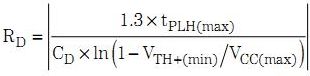 當(dāng)總線電壓變?yōu)檎╒Bus > 200 mV)時(shí),RX1 輸出變?yōu)楦?,其?qū)動(dòng) DR2 輸出為高,并通過(guò) RD 對(duì) CD 緩慢充電。必須正確計(jì)算最小時(shí)間常量(RD × CD),以使最大電源電壓 VCC(max) 和最小正反相器輸入閾值VTH+(min) 時(shí),延遲時(shí)間tD 超過(guò)驅(qū)動(dòng)器最大低到高傳播延遲 tPLH(max),即超出 30%。例如,電容為 CD = 100 Pf 時(shí),RD 的要求電阻值為: