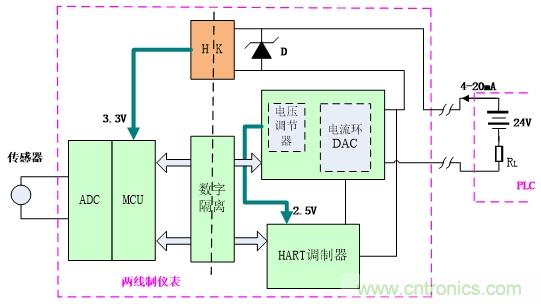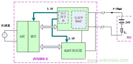 圖一的電路中,傳感器的信號(hào)經(jīng)過ADC轉(zhuǎn)換成數(shù)字信號(hào),再經(jīng)MCU發(fā)送給電流環(huán)DAC及HART調(diào)制器,形成4-20mA的信號(hào)輸出,電流環(huán)DAC從PLC輸出的4-20mA總線上取電,經(jīng)內(nèi)置的電壓調(diào)節(jié)器輸出3.3V及2.5V,給MCU及HART調(diào)制器提供少量的電源。