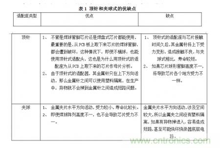 夾球和頂針式的適配座,各有優(yōu)缺點(diǎn),應(yīng)用在不同場合,如表1所示。