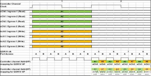 統計流四通道和一秒(處理器)更新四通道接口作為應用通道。QDR IV控制器采用帶有為QDR IV端口A和端口B定義的專用四通道端口界面的4:1/1:4通道復用/解復用功能。QDR-IV控制器以固定順序對通道進行復用和解復用,應用端和以4X時鐘頻率運行的QDR IV設備端之間的順序為ch0、ch1、ch2和ch3。圖3為所假設的QDR-IV控制器順序和建議的QDR IV HP統計計數器解決方案和QDR IV XP統計計數器解決方案應用通道映射。