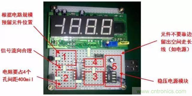 電源貫穿電路始終,合理的電源布局對簡化電路起到十分關鍵的作用。某些洞洞板布置有貫穿整塊板子的銅箔,應將其用作電源線和地線;如果無此類銅箔,你也需要對電源線、地線的布局有個初步的規劃。
