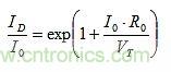 實際的電流比因指數(shù)函數(shù)而要求R0兩端的電壓不要大于VT。對于I0 = 2mA,R0 = 22Ω,VT = 26 mV,R0兩端的電壓為44mV或1.69xVT,ID = 14.77xI0 = 29.5mA,大于多數(shù)設計所需的值。為了使R0不在發(fā)射結電路中占主導地位,需要R0為這樣的小值,以便能表示VBE的TC。然而在許多設計中,R0相對較大,且其壓降遠遠超過VT。因此,re的TC%(VT)沒有得到正確補償,增益中存在TC漂移。