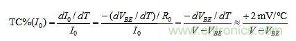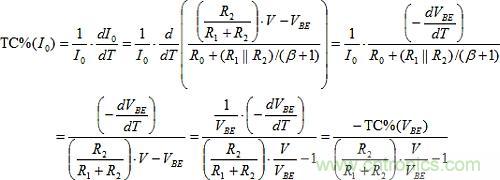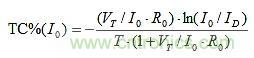 TC%(I0) = TC%(IE)的設定可以建構如下。R0上的唯一變化來自VBE。因此,由T引起的I0的分數(shù)變化是: