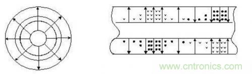 以常用的同軸線為例,同軸線的主模為TEM波,場分布見下圖: