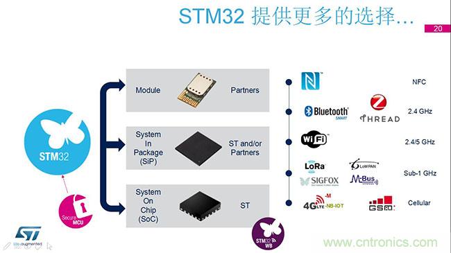 除了MCU硬件以外,ST還提供SOC以及與第三方合作開發的模塊化產品,在NFC、藍牙、WIFI、LoRa方面也有成熟模塊。而關于軟件開發工具,ST一直在提供STM32CubeMX,支持第三方編譯和調試,還能監控無線通訊狀態。針對較關注安全機制的物聯網應用,ST逐漸增加了包括AES等不同安全級別產品供廣大客戶選擇。