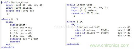 設(shè)計(jì)一個(gè)二位4路選擇器,由于選擇器使用條件觸發(fā)的方法對(duì)應(yīng)真值表進(jìn)行匹配輸出與輸入,因此可以聯(lián)想到在C程序設(shè)計(jì)中的條件語句“If”和“Case”兩種,那么這兩種設(shè)計(jì)從硬件的角度出發(fā)有什么不同呢?