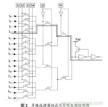 多路選擇器的左邊是 16 條輸入線,用于連接布線軌道或可編程邏輯塊等資源,S1~S6 代表 6 個(gè)可編程SRAM 單元,通過配置 SRAM 單元的內(nèi)容可以從 16條輸入線中選出 1 條作為有效輸入端,例如,當(dāng) S1~S6存儲(chǔ)單元的存儲(chǔ)值為“000100”時(shí),輸入線 I3被選擇中,信號(hào)所經(jīng)過的有效路徑如圖 2 中虛線所示。多路選擇器的主體部分是傳輸晶體管,由于 NMOS 晶體管載流子的遷移效率高,電路速度快,因此,多路選擇器中的傳輸晶體管均采用 NMOS 晶體管實(shí)現(xiàn)。