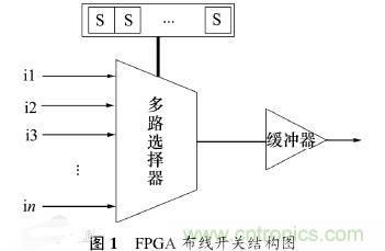 在FPGA各種資源中,可編程邏輯塊是實(shí)現(xiàn)用戶功能的基本單元,每個(gè)可編程邏輯塊包含1個(gè)互連開關(guān)矩陣和4個(gè)SLICEs,其中每個(gè)SLICE包括2個(gè)查找表(Look-Up-Table,LUT)、2個(gè)觸發(fā)器和一些多路選擇器。互連開關(guān)矩陣主要由不同長度導(dǎo)線和多個(gè)布線開關(guān)組成,典型的布線開關(guān)結(jié)構(gòu)如圖1所示。
