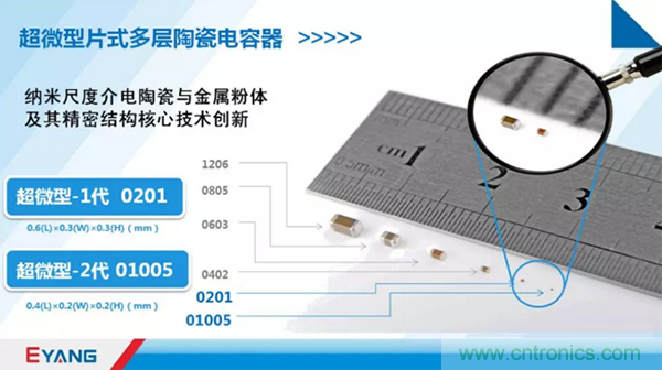 宇陽科技從2001年成立之初便明確了超微型化MLCC的發展方向。從0402做起,始終進行著超微型產品的開發與產業化。消費類電子產品未來的方向一定是多功能、小型化或者是輕薄化、便攜式。對所有元器件來講,無論是從低功耗的角度考慮,還是從整個設計考慮,都是微型化的發展方向。憑借對MLCC的專注和堅持,宇陽成為國內最大的MLCC廠商,目前0201尺寸MLCC產銷量已經躋身全球前三。