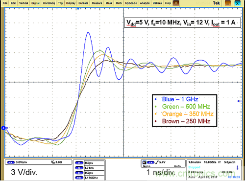 從[1]可清楚看出,可用的最高系統(tǒng)帶寬低于基于EPC8009的設(shè)計的振鈴頻率。現(xiàn)在我們將觀察選擇不同的系統(tǒng)帶寬如何影響采用更高速的GaN晶體管(如EPC8009)和相對較慢的GaN晶體管(如EPC2045和EPC2022)的開關(guān)節(jié)點波形。