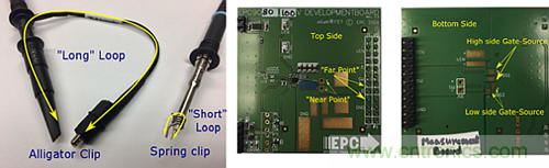 本節(jié)測量技術(shù)使用EPC9080半橋演示板。開關(guān)節(jié)點波形在圖3所示的兩點測量:靠近FET開關(guān)節(jié)點的“近點”;以及PCB外圍引腳端子處的“遠(yuǎn)點” 。圖4顯示了每個探測點和配以探頭技術(shù)所測量的開關(guān)節(jié)點(VSW)的波形。