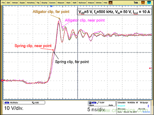 圖4的測得波形清楚地表明,探頭技術(shù)比測量點的選擇重要。雖然有邊緣衰減,紅色和黑色波形幾乎相同。無論測量點的選擇如何,使用鱷魚夾時的波形形狀都非常不準(zhǔn)確。我們建議,彈簧夾技術(shù)應(yīng)與最靠近功率器件的測量點(“近點”)結(jié)合使用。