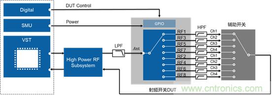 在量產(chǎn)測試中,信號分析儀相對較高,因此依然可以使用矢量信號收發(fā)儀搭配高功率模塊來實現(xiàn),最大化復用之前測試項所使用的儀器。
