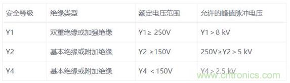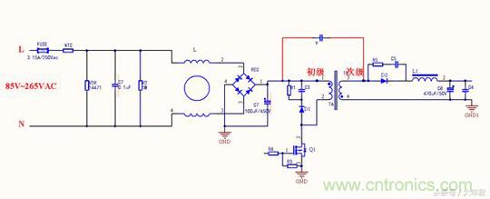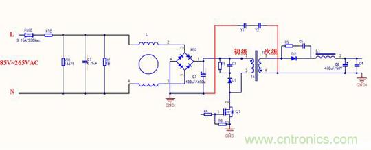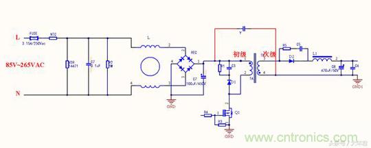 我們都知道Y電容是安規(guī)電容,是跨接L線地以及N線與地之間的電容,它的作用是抑制共模干擾?,F(xiàn)在一共有三種等級(jí),分別是是Y1, Y2, Y4。由于漏電流不能太大這是安規(guī)要求,漏電流太大人體觸摸用電器會(huì)有一種麻麻的感覺,因此一般Y電容容量大小為1nF到4.7nF之間。