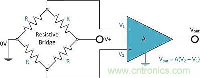 惠斯通電橋(或單臂電橋)電路應(yīng)用非常廣泛,如今在現(xiàn)代運(yùn)算放大器中,我們可以將惠斯通電橋電路與各種傳感器連接。不同于將一個(gè)未知阻值與已知阻值相比,惠斯通電橋在電路中有很多用法。惠斯通電橋電路就是在電源端和接地間兩個(gè)簡(jiǎn)單的電阻串并聯(lián),當(dāng)電橋達(dá)到平衡時(shí)兩個(gè)并聯(lián)分路間產(chǎn)生零壓差。