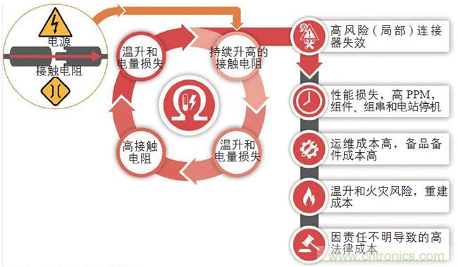 電站的盈利能力與選擇高質(zhì)量的部件息息相關(guān)。業(yè)主在光伏連接器上節(jié)省資金,并不是一種明智的做法。因為,不注重質(zhì)量,通常意味著后續(xù)的高損失和風(fēng)險,而這些本可避免。光伏連接器的低接觸電阻及長期可靠性,能夠保障電站高效和安全運行。而持續(xù)升高的接觸電阻會導(dǎo)致光伏項目的安全風(fēng)險大幅提高,降低電站運行效率。需要指出的是,各種不同的風(fēng)險因素是密切相關(guān)的,如圖1 所示。