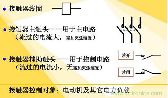 接觸器用來接通或斷開功率較大的負載,用在(功率)主電路中,主觸頭可能帶有連鎖接點以表示主觸頭的開閉狀態。