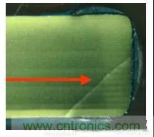 因?yàn)镸LCC主要成分是陶瓷,在放置元件,分板,上螺絲等工序中,很可能因?yàn)闄C(jī)械應(yīng)力過(guò)大導(dǎo)致電容受擠壓破裂,從而導(dǎo)致潛在的漏電失效。此時(shí)的裂縫一般呈斜線,從端子與陶瓷體的結(jié)合處開裂。