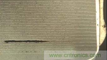 熱沖擊主要發(fā)生在波峰焊時(shí),溫度急劇變化,導(dǎo)致電容內(nèi)部電極間出現(xiàn)裂縫,一般需要通過(guò)測(cè)量發(fā)現(xiàn),研磨后觀察,通常是較小的裂縫,需要借助放大鏡確認(rèn),少數(shù)情況下會(huì)出現(xiàn)肉眼可見(jiàn)的裂縫。