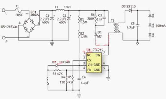 下圖是采用PT4215的3W LED燈杯的典型應用電路。驅動電路采用反激架構,工作在DCM模式。采用無光藕設計,方案簡潔可靠,成本低廉。驅動電路能夠接受85VAC~265VAC輸入范圍,輸出電流300mA,驅動3顆1W LED串聯的燈串。